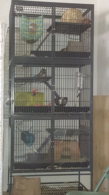 Jasper is not a PET by any means. He was a WILD Adult male squirrel when he was hit by a car. He does not like humans. He is quite aggressive. He tolerates interaction for treats although is very grabby and often scratches if you try to offer anything by hand. He had to be bathed regularly since he has no real bladder control but he does seem to be living a happy and healthy life in captivity where we give him lots of animal enrichment to keep his mind active. He has progressed over the past year to have minor strength in his hind end, not enough to walk properly but more then he has since intake. He will never be released but we hope he will at least have a good quality of life, living a life of luxury, free of predatory and cars and plenty of treats and love. And of course Mike is never satisfied with "good enough" he is always looking to improve and make a bigger and better life for the animals he loves and recently upgraded Jasper to a BIGGER cage with lots of wooden things for him to play and chew which will be replaced as needed.