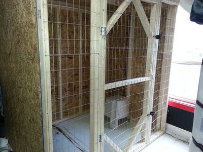 Before long Rudy was strong enough to start breaking and bending the wires on the dog playpen so we moved him to a large outdoor pen that we use to use for pre-release raccoons hoping that he would enjoy the large space. Well that was an epic fail. He was terrified of the large open space, he would climb the 6 foot tall fencing and fall (luckily we took him falling into consideration and lined the bottom of the cage with a few feet of fluffed hay) and then he would stay in the far, back, corner of the cage and cry for hours. Even after a few weeks he never really adjusted. We started brainstorming to figure out what else to do to make him more comfortable, confident and feel secure. Michael once again came up with an idea of building a cage inside and between his funding and talking through the idea with my husband together they fashioned a huge indoor cage for him to keep him safe and make it fairly easy to keep clean.